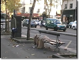 looking at them. Part of the daily activity of the homeless is shopping. If you have any money at all you can go shopping. But you are not shopping for expensive things like clothes or funiture; usually you are shopping for food. Moreover, no matter how limited your diet, you can always shop for a bargain or something different. Even if you are shopping for a cheap bottle of wine, there are choices. Ditto for a sandwhich or a baguette or some cheese. Life is full of choices at all economic levels. And, fortunately, most grocery stores are not geared toward the tourist. Shopping was also an opportunity to have a little fun. Corinne and I were now comparing prices and bragging about bargains. In fact, she had bragged to me that her can of Haricot Rouge cost her only 61 centimes. When I was shopping in the late afternoon at Franprix in the Latin Quarter I had a look at the canned-foods section. I found the same can of beans, but about twice as large, for only 99 centimes. I would let her know tomorrow that she was paying too much! In fact I worked it out: She was paying 11.5 centimers too much. Would her lawyerly mind, if it were like other lawyerly minds, knowledgeable of fees, appreciate that difference? I thought so. I bought a sandwich for 1.99 euros, a wedge of Brie for 1.18 euros, and a bottle of wine for 1.60 euros. Then I stopped by a boulangerie for a baguette—85 centimes—and headed for the river. On the way I thought about a young man I saw earlier in the day on Boulevard St. Germain. I had been paying my respects to Les Deux Magot and Café de Flore and also Église St. Germain de Prés. He was sitting at the corner on a piece of cardboard with a paper cup in front of him and holding a dog when a police van pulled up and three cops got out. A burly cop asked him for his papers in a loud voice. The young man said nothing but reached inside of his coat and pulled out his papers. His little dog huddled inside of his coat. The cop looked at his papers for awhile, said nothing, then handed them back. The three cops got back into the van and drove off. He was a decent-looking young man and it was a little odd to see him out on the street. He looked down towards the paper cup. I walked over and dropped a euro in his cup. He tried to mutter something but nothing came out. Had poverty silenced his tongue, or had mental illness? Or had they conspired together to silence him? Whatever the case, he had drawn inward.